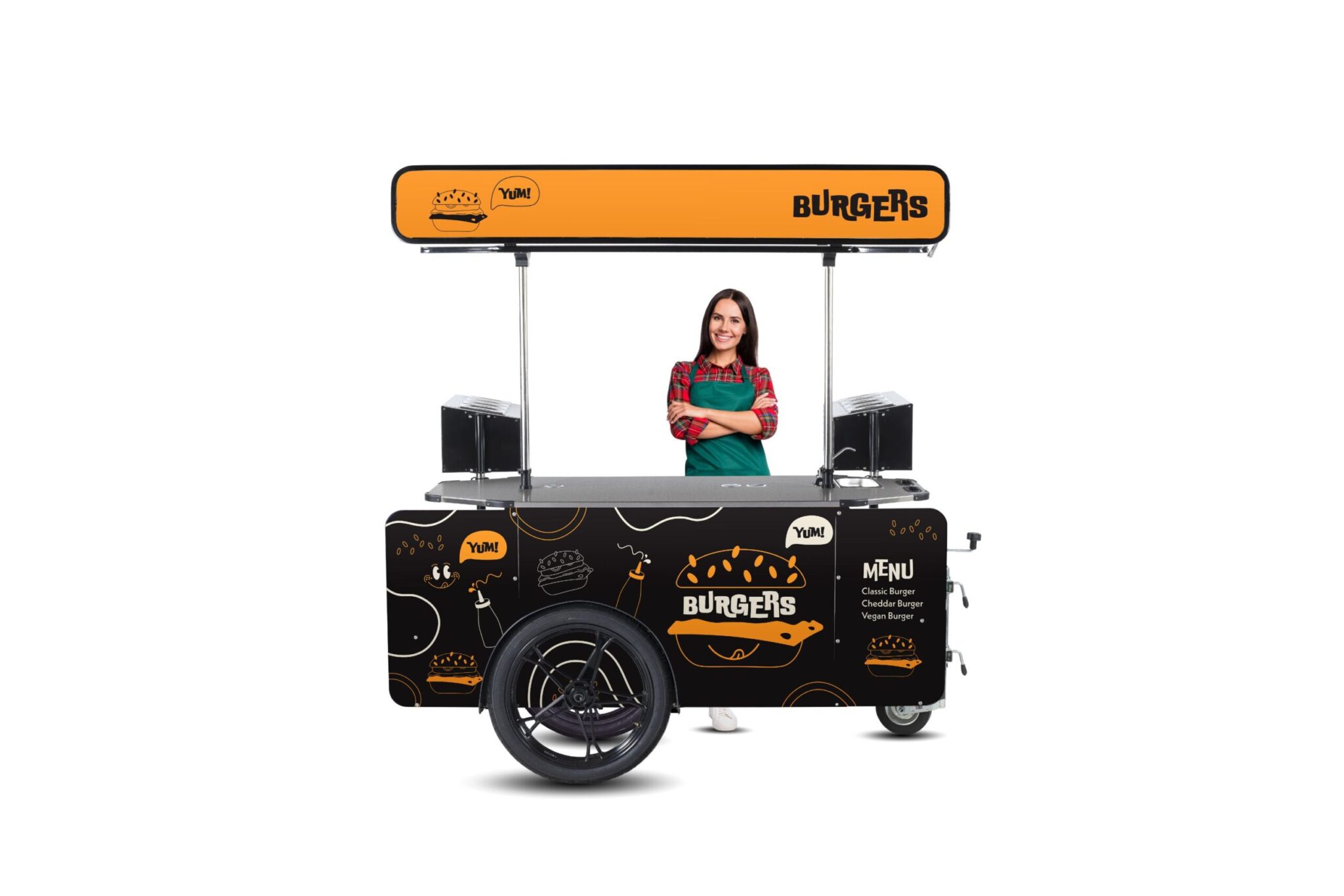 Product Details: Street Food Cart L – Mobile food cart designed for outdoor and indoor use, customizable with printed decals, made in the EU, and comes with a 2-year warranty.
